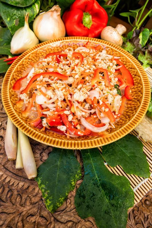 Ensalada de pollo o cerdo picado con menta y hoja de lima